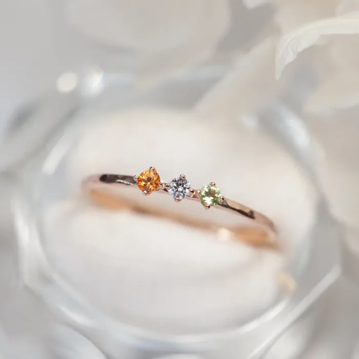 【実例478】アクアマリン、ペリドット、ブルームーンストーンのご家族の誕生石リング -