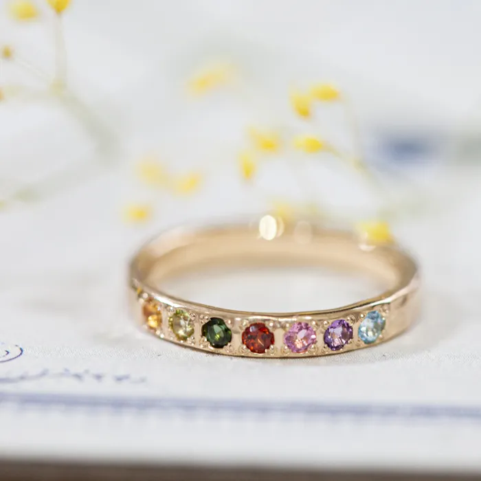 【実例480】ご家族の誕生石を埋め込んだ槌目リング -