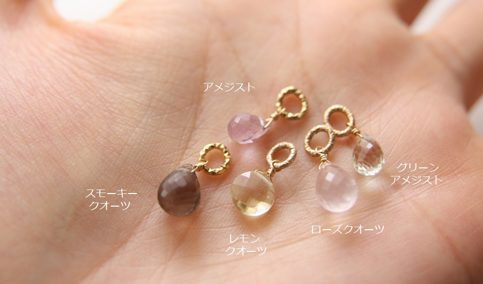 | 大きさ | スモーキークオーツ 約8×6mm アメジスト 約7×4.5mm グリーンアメジスト 約7×5mm ローズクオーツ 約9×6mm レモンクオーツ 約6.5×6.5mm アクアマリン 約6×4.5mm ペリドット 約6.5×4.5mm プレナイトB(小) 約7×4.5mm プレナイトA(大) 約10.5×7mm アメトリンA 約9.5×5mm アメトリンB 約8.5×4.5mm |
