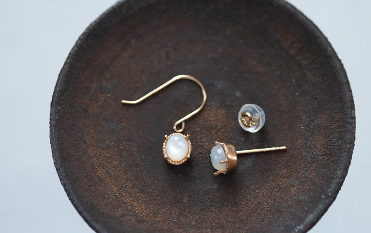 ネジバネ式のイヤリングも制作可能ですが、金具がとても高価で価格がかなり上がります。(K10:+9,000円、K18:+15,000円。)
